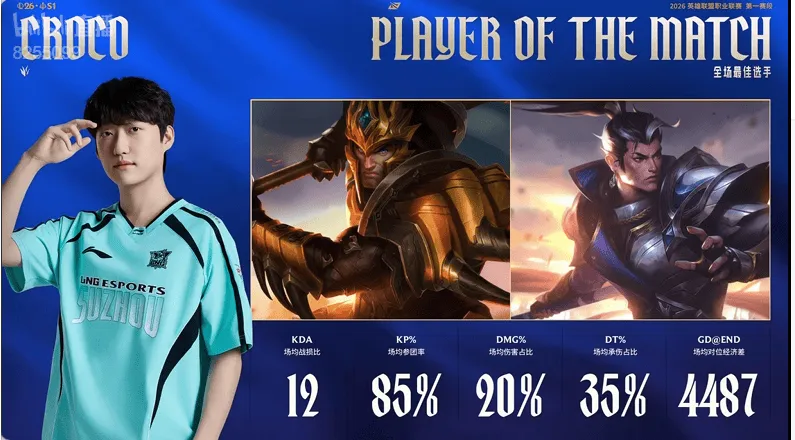 虎扑01月16日讯 在LNG对阵OMG的BO3中,Croco拿下LNG对阵OMG全场MVP